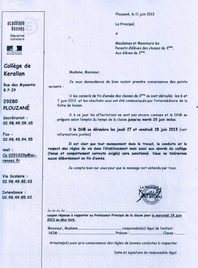 note aux parents déroulement du DNB et fin des cours |
