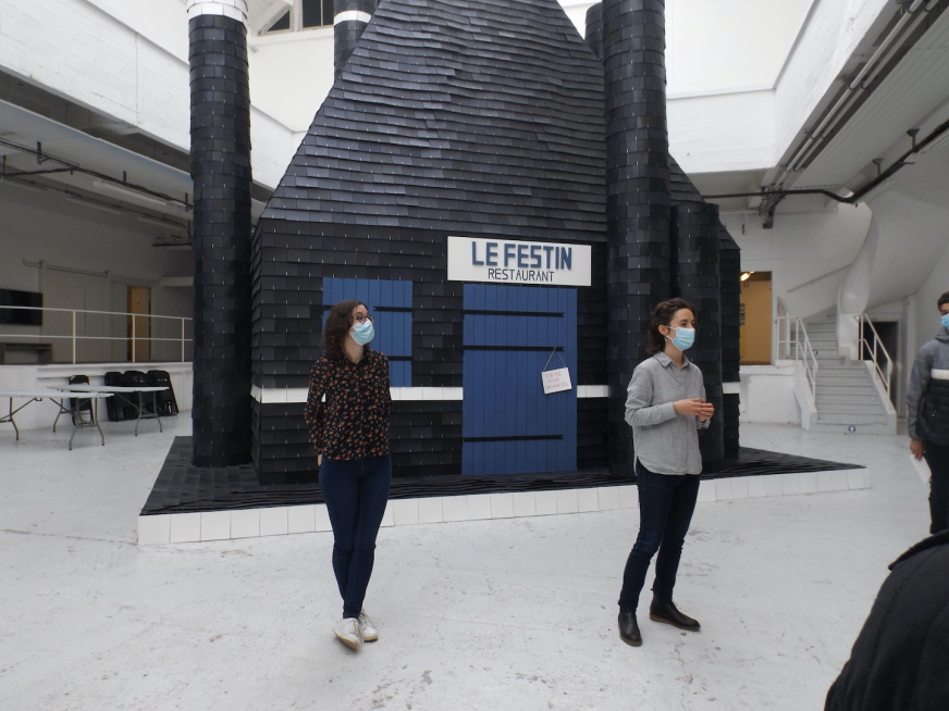 Arrivés au Centre d’art « Passerelle », les 3es C ont découvert un bâtiment immense (il servait d’entrepôt par le passé) et surtout une oeuvre d’art monumentale ! Cette exposition de l’artiste Caroline Mesquita faisait en effet écho à leur travail en classe sur l’architecture, sur les maquettes, sur le volume… bref, sur les sujets évoqués dans les articles précédents du site (pour celles et ceux qui ne les auraient pas encore lus, nous vous renvoyons vers l’onglet « Arts plastiques » de notre site).