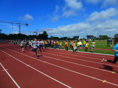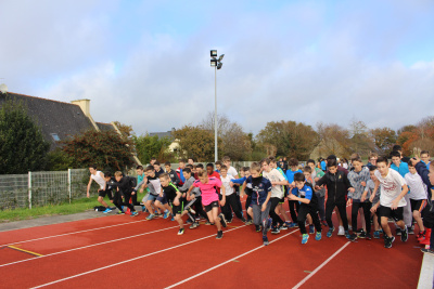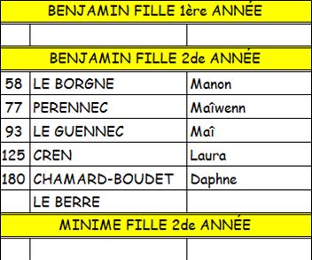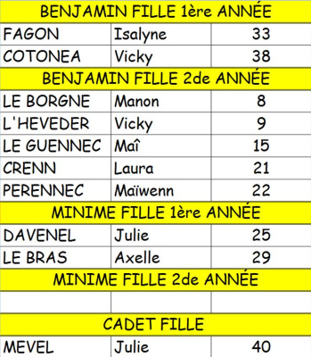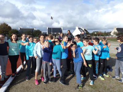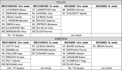 Petite déception chez les Benjamines 2, qui pouvaient prétendre à mieux, première expérience difficile pour les BG 1, sans pointes pour certains, dans la boue, mais motivés pour l’an prochain … Equipe incomplète chez les BG 2, dommage ! Clarisse et Agathe ont défendu leur place dans une course rapide chez les Minimes Filles 1, et toujours Brian (MG2), présent contre vents et marées, 15è au District et 46è au Finistère…